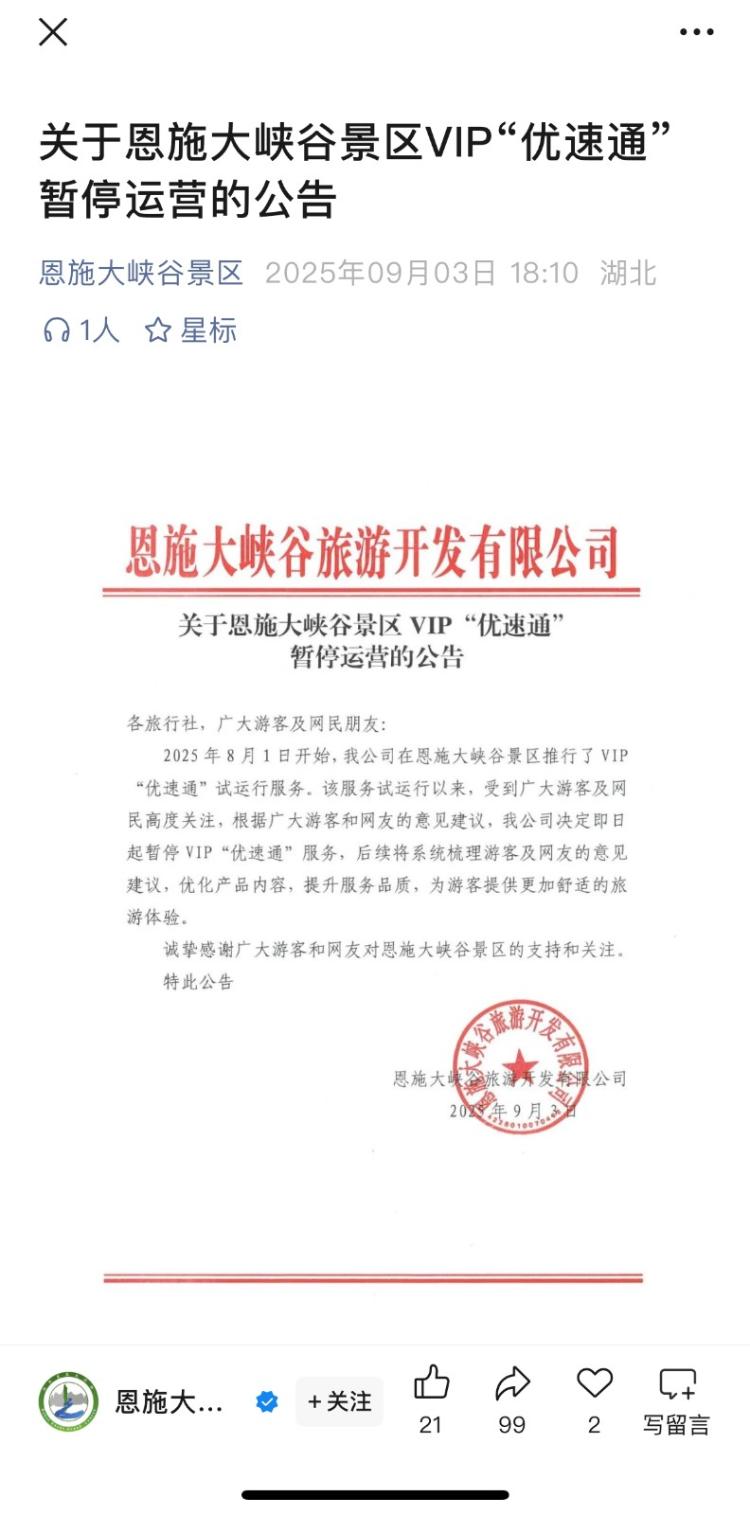 海报新闻首席记者李Zijiao在审判审判后的33天,湖北的Enshi Grand Canyon风景区在争议中停止了VIP Service“ Yousuge”。 9月3日晚上,微信对Enshi Grand Canyon帐户的官方帐户发布了公告:“从2025年8月1日起,该公司从现在开始启动了Enshi Grand Canyon'Usakan'服务的VIP'USAKAN'地区。”实际上,许多人不熟悉“我们”。对于迪士尼和环球影城而言,它几乎是标准的,而且并不便宜。为什么它无法将同一商业模式转移到大峡谷Enshi?旅游不公的感觉从何而来?资料来源:Enshi Grand Canyon风景区域微信官方帐户想改善旅行体验,但要依靠“ Yousakan”? Enshi Grand Canyon是5A水平的国家旅游景点和国家地质公园。它位于“ 30度北纬”,并以“世界地质奇迹”闻名al and Eastern Colorado". Its ecological environment is unique and its natural scenery is primitive and simple. It is the only "land crack-sink-sink-rock column group" in the world that coincides with the same time as the "Nature Museum" of the Composite Karst Landform. Cloud Dragon Crack is called "the most beautiful scar on the ground." In October 2010, the Enshi Grand Canyon officially opened publicly. In recent years, the number of passengers in the Enshi Grand Canyon根据Enshi文化和旅游局的官方数据迅速增加,2024年,Enshi Grand Canyon的年度数量超过了200万次,在今年的劳动节中,这是每日收据的最高收入。 Enshi Grand Canyon获得了650,000多个游客。游客还导致许多游客报告说,旅游经验变得更糟。 On social platforms, there are many complaints about the Enshi Grand Canyon tourism experience, mainly including "long queues", "expensive tickets", "unreasonable route planning", "severe commercialization", etc. In the early August, Enshi Tourism Group, the investment manager of the Enshi Grand Canyon Shenic Area in Hubei, the investment of the Enshi Grand Canyon Shenic Area in the Hubei, the Hubei information, of官方微信官方帐户中的“ Yousuto”。 Its main point of sale is "exclusively fast passecable car, shuttle buses, etc. However, "YouSuto" in the Enshi Grand Canyon not only failed to solve the problem, but instead caused more doubts and accused "unfair". It is common for a society platform to complain about "priority priority". Why is the Enshi Grand Canyon "Copying the Wrong House"? The reporter found that the dispute was primarily focused on two points. One就是那好的地方很清楚旅游痛苦的点,但是为什么不改善设施和加强管理,而是鼓励付费跳入队列,谁违反了公平原则呢?为了越来越容易理解,“ YouSuting”服务将“优先考虑”。除了娱乐公园外,生活中还有许多例子,例如“首次访问”机场安全检查,特殊医院诊所,银行VIP服务等。首先,对于购买“美国”服务的消费者来说,如果投资和利益相当成比例,那么通常的一切通常都会违约,但是Enshi Grand Canyon被准确撤销了“公平规模”。在门票价格方面,680元Yousakan包括370元的Enshi Grand Canyon“ Dalian票”价格,这也意味着实际高速公路服务的附加值为310元,几乎等于票务本身。成本的有效性不是很低,但是获得了运输的优先级,并且高度讨论了成本效益。此外,大多数娱乐场所的“ YouSuting”价格实际上并未固定并根据诸如流动NG乘客的流量和峰值峰的因素进行调整。例如,北京环球影城的价格范围为400元到1,800元,上海迪斯尼的独家卡的价格范围在360元到2500元之间。与475元到799元的主要门票相比,高峰时间的价格甚至是门票价格的2-3倍。此外,就USB的模式设置而言,Enshi Grand Canyon几乎像这样复制了停车场收费,但没有复制其成熟的背景操作。例如,迪士尼拥有一项名为“ VIP指南”的服务。只要您购买此服务,独家工作人员就会带消费者参加各种项目。无需排队,而不是“隐藏的入口”,例如员工EXCERPT和特殊电梯。 Enshi Grand Canyon风景区域是H交通线并未优化以减轻普通游客的焦虑,也不会在视觉上与常规队列相距。许多游客也认为这种模式“鼓励伪装成沿线的费用,这违反了公平原则”。资料来源:Enshi大峡谷风景区域微信自然风景区域与人工设施。与这些特征有关的第二点是指价格差异是,好地方和娱乐设施的自然区域的特征是不同的。复制游乐园的充电大纲是公平而合理的吗?主题公园“ Yoursuge”提供了更多人工项目的体验,而自然美丽的地方的主要来源是共享地形。当自然的场景与裸眼互动时,没有任何情况需要减少队列的时间很多项目。中华人民共和国的旅游法也清楚地确定了使用公共资源建造的好领域不会通过增加额外的费用而变相提高价格。在迪士尼和环球影城的“人满为患”的另一端,这种公园主题的建设成本很高。上海迪斯尼项目的第一阶段的建设成本达到了340亿元人民币,北京环球影城项目的第一阶段的建筑成本达到了460亿元人民币。相比之下,自然美丽的地方的投资较小。根据其官方运营商网站E Travel Co,Ltd的信息,以1.3亿元人民币为例,以Enshi Grand Canyon为例。根据Enshi市政发展和改革局发布的数据,Enshi Grand Canyon的另一个重要旅游项目地面缆车的总投资为1.66亿元。根据中国旅游新闻的报道,埃希大峡谷风景区的主要投资者fang en旅行集团已投资了近2次,合并于2011年进入市场。 “诸如山脉,河流,湖泊或重要文化遗产之类的自然资源具有公共财产和公共资源,并且具有垄断的自然财产,即,全世界是'唯一的'。这些资源用于发展旅游业,需要确保旅游业的公平。”中国旅游研究所的研究人员黄黄(Huang Huang)表示,不仅如此的好地方贝多(Bedo)不应该增加现有票价价格内的隐式消费,并
